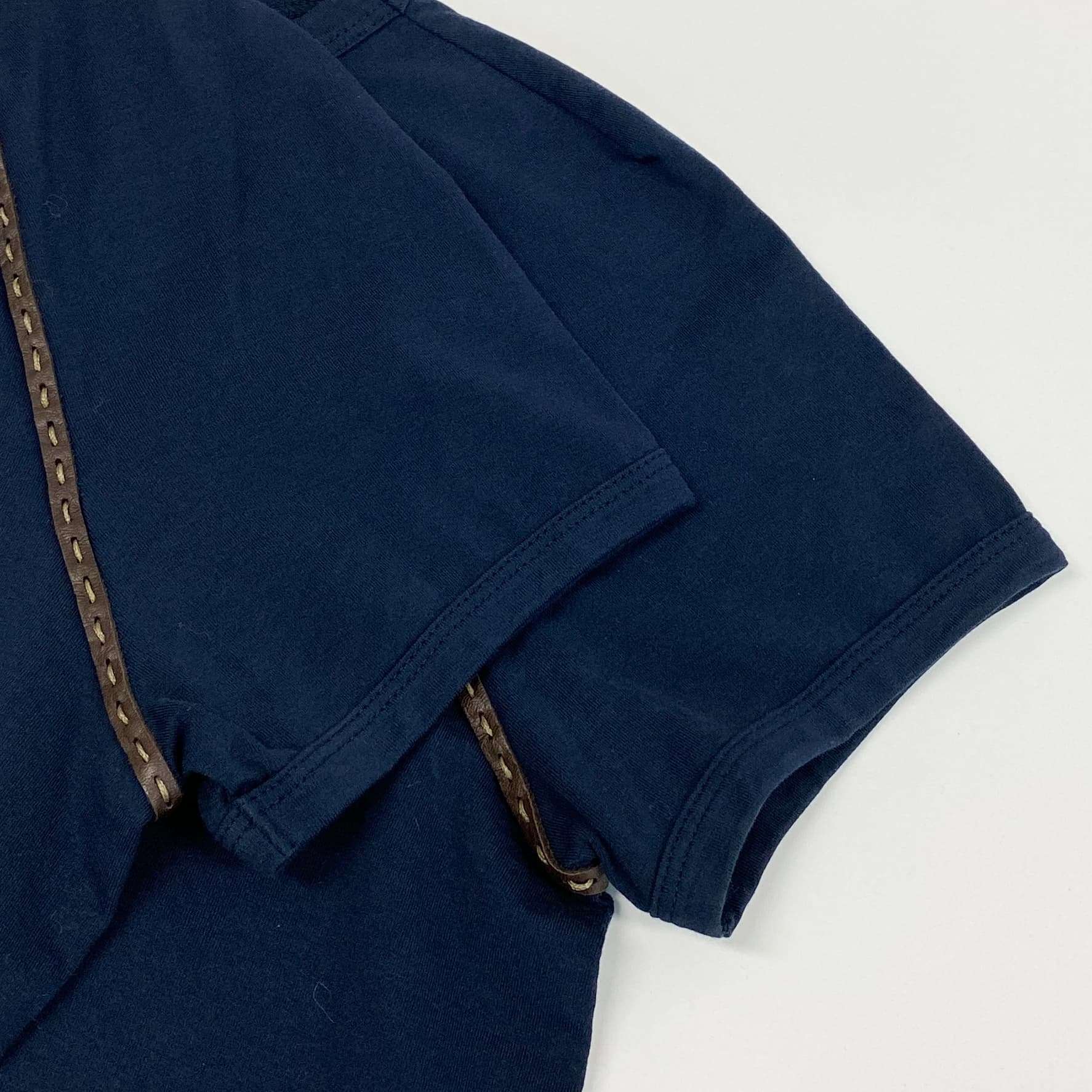 深みのあるミッドナイトネイビーカラーが上品なFENDIの半袖Tシャツです。マットなコットン素材に、ショルダーラインへあしらわれたレザーパイピングがアクセントになっています。無地デザインながらも異素材ディテールがさりげないラグジュアリー感を演出。デニムやスラックスと合わせたカジュアルスタイルから、ジャケットインのきれいめコーデまで幅広く活躍します。落ち着いたカラーリングで長くご愛用いただける一着です。