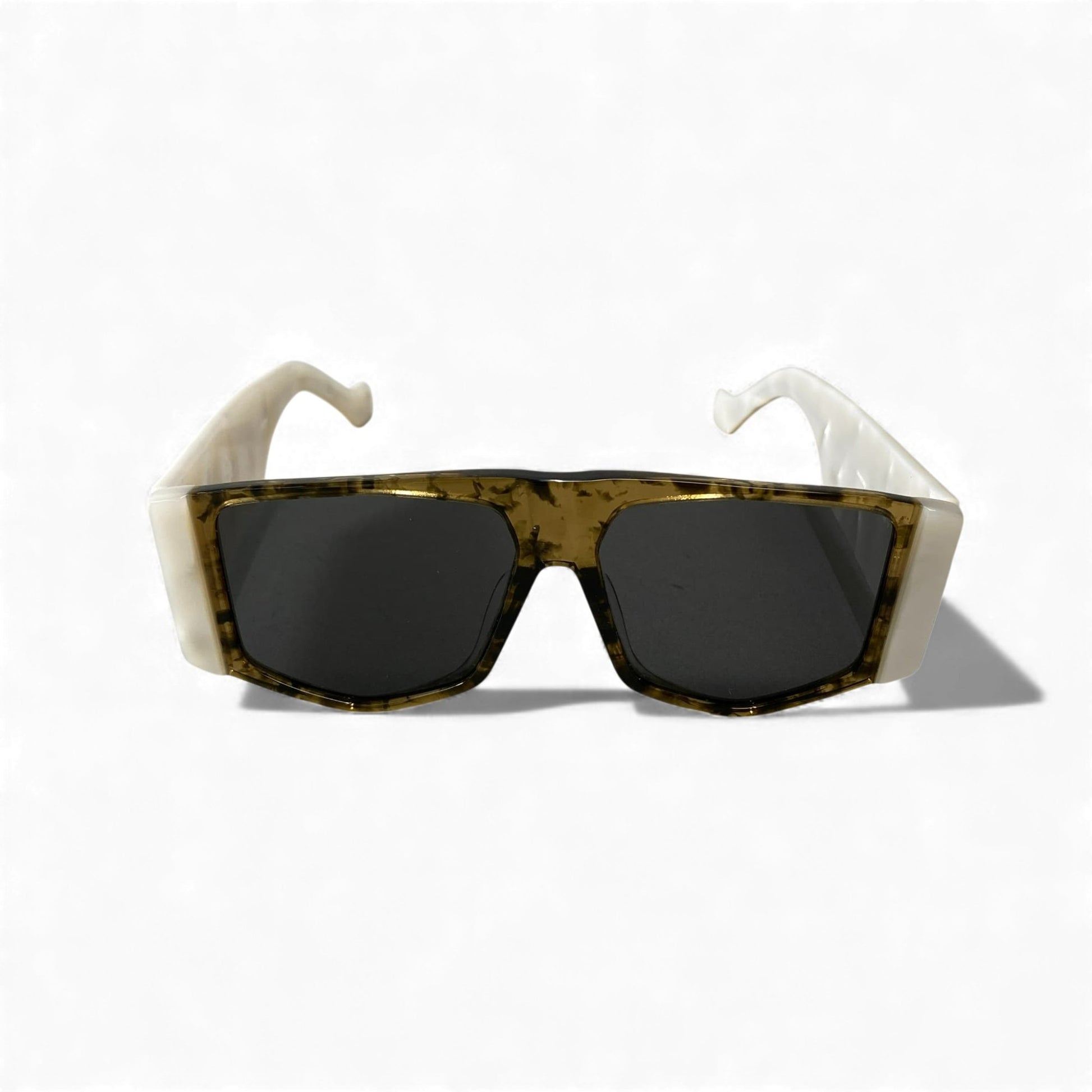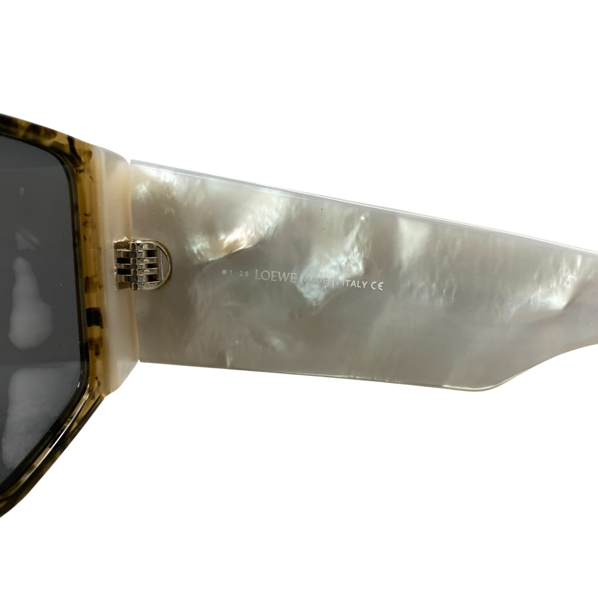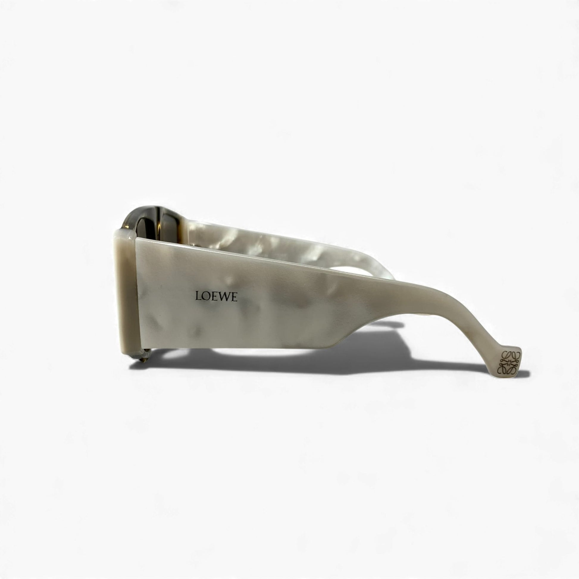 クリアブラウンのフロントとマーブル調ホワイトのテンプルを組み合わせた、ロエベ LW40026U のバイカラーサングラスです。立体的で厚みのあるアセテートフレームが存在感を放ち、ダークレンズがモード感を引き締めます。ワイドなスクエアシェイプが顔まわりをシャープに見せ、スタイリングのアクセントとして抜群のインパクトを発揮。日差しの強いシーンやドライブにも適した遮光性を備え、デザイン性と機能性を兼ね備えた一本です。