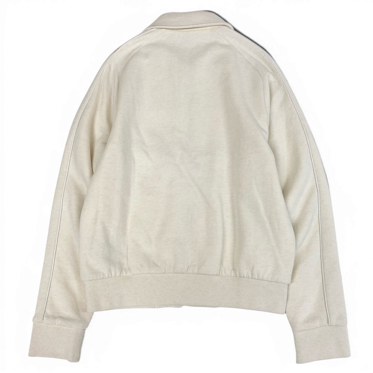 上品なエクリュ/オフホワイト系カラーに、胸元の同色系刺繍モチーフが映えるミニマルなコットンブルゾン。マットで滑らかなコットン素材に、ダブルジップ仕様とパイピング風の切り替えが洗練された印象を与えます。ラグランスリーブにより肩周りの可動域が広く、日常使いからきれいめカジュアルまで対応。デニムやスラックスと相性が良く、春秋のライトアウターとして活躍します。
