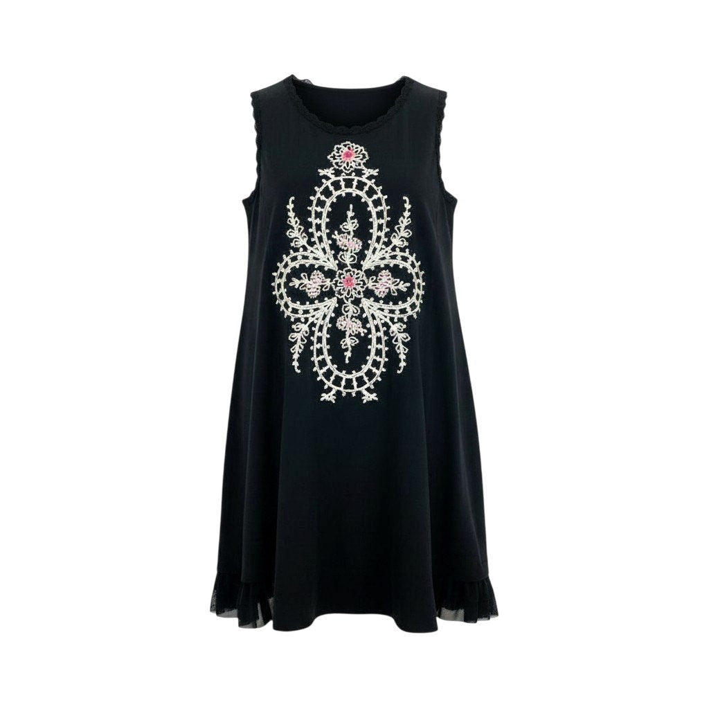 上品な ブラックカラー に、胸元の アイボリー刺繍×ピンクスパンコール が華やかに映える、トクコプルミエヴォルらしいエレガントなノースリーブワンピースです。ネックラインと袖ぐりには繊細なレースをあしらい、裾にはチュールを重ねて立体感のあるフェミニンなシルエットを演出。Aラインの落ち感が美しく、1枚で存在感のあるコーデが完成します。発表会・ディナー・お呼ばれなど、特別なシーンにもぴったりの一着です。