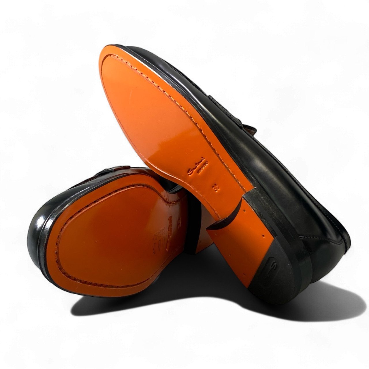 滑らかなブラックレザーで仕立てられた、Santoniの上質なコインローファーです。光沢を抑えた上品なレザーに、丁寧なステッチワークと端正なシルエットが際立つ一足。シンプルながらもイタリアブランドらしい洗練されたラインで、パンツ・スカートどちらにも合わせやすい万能デザインです。柔らかいレザーが足に馴染み、長時間歩いても疲れにくい快適な履き心地。通勤からきれいめカジュアル、ちょっとしたフォーマルまで幅広く活躍する、永く愛用できるレザーローファーです。