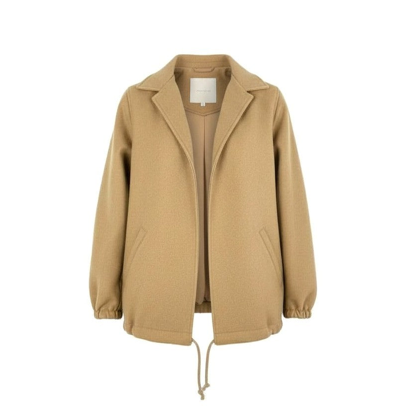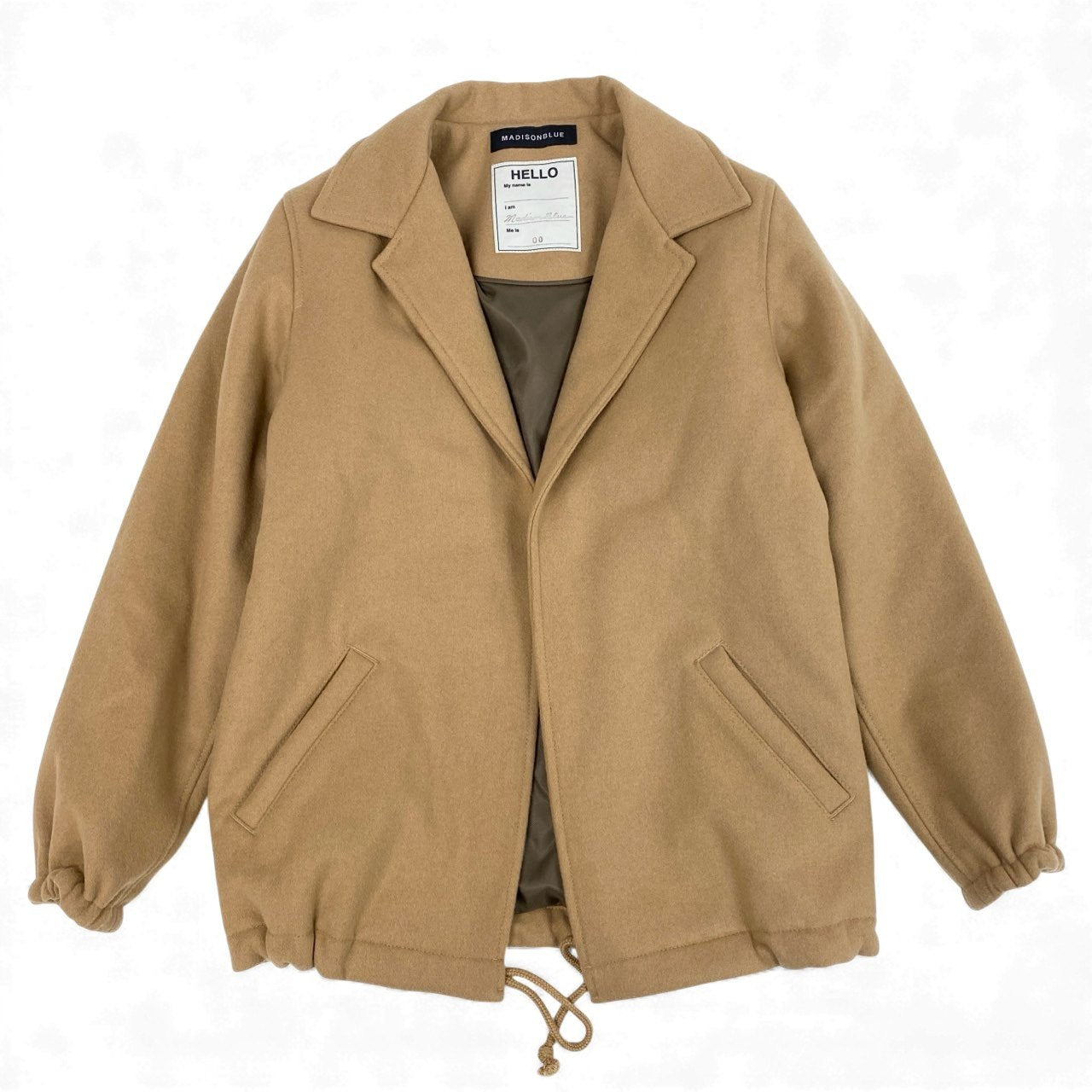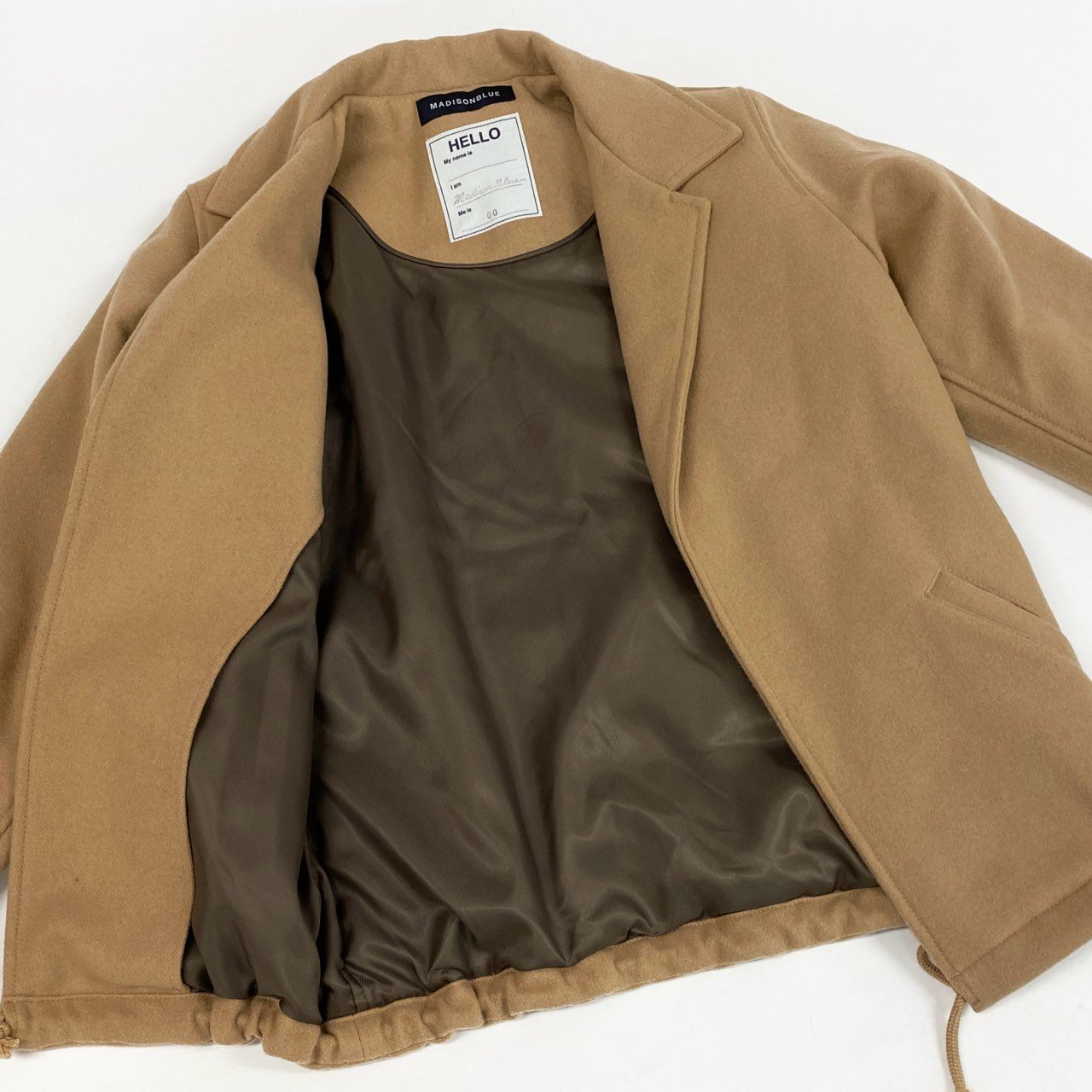 キャメルブラウン系の落ち着いた色味が魅力の、MADISON BLUE 2024AW メルトンウールコートです。無地デザインにマットで目の詰まったウールメルトン素材を使用し、上品で洗練された印象に仕上がっています。コーチジャケットをベースにしたデザインで、裾のドローコードやボリューム感のある袖が程よいカジュアル感をプラス。きれいめから大人カジュアルまで幅広く合わせやすく、季節の主役アウターとして活躍する一着です。
