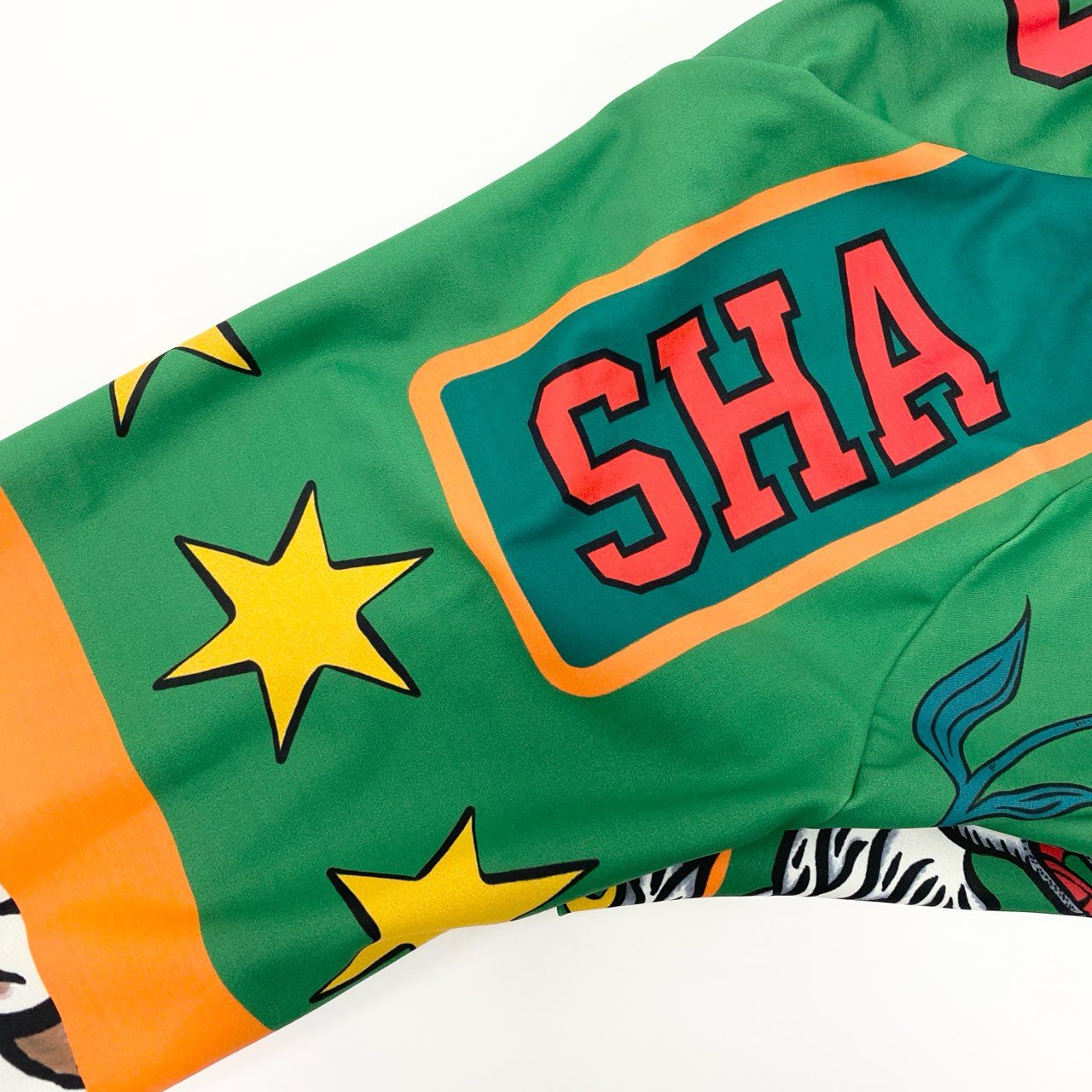 鮮やかな リーフグリーン × オレンジ × イエロー を基調とした、Walter Van Beirendonck(W<)のロングスリーブカットソーです。迫力のあるアニマルモチーフとスター柄、グラフィックプリントが全体に施された、コレクションらしいアート性の高い一枚。マットなポリエステル系の素材感で軽量かつ扱いやすく、スポーティなファスナー仕様がアクセントになっています。ストリート、ライドシーン、イベントコーデなどでインパクトを出したい方に最適です。唯一無二のデザインを求める方におすすめのアイテムです。
