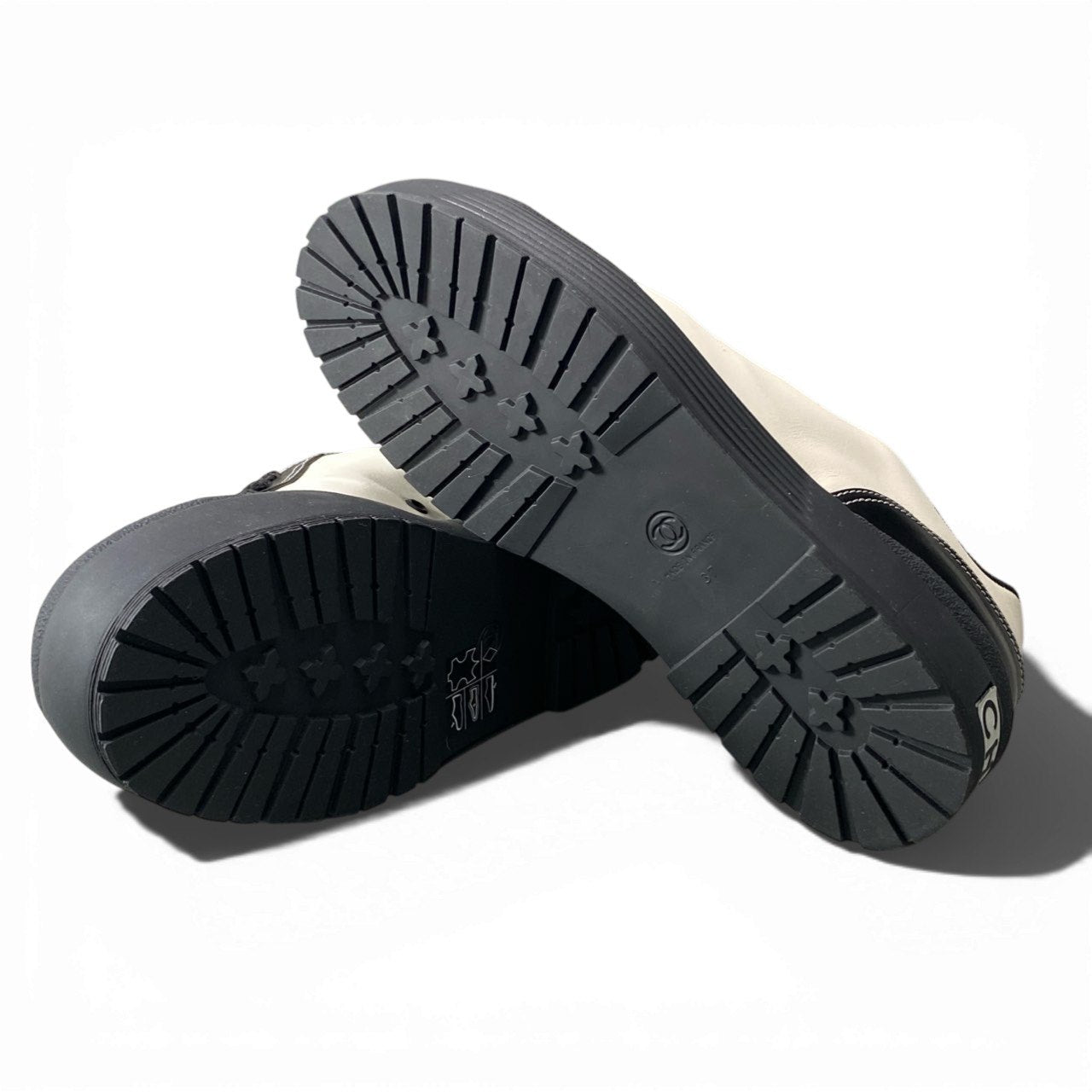 ブラック×アイボリーのバイカラーデザインが印象的なCHANELのヴィンテージローカットスニーカーです。 つま先部分にはブランドを象徴するココマーク刺繍が施され、さりげないラグジュアリー感を演出します。 マットな質感のレザー素材とホワイトステッチがコントラストになり、クラシックで洗練された雰囲気に仕上がっています。 厚みのあるブラックソールが安定感を与え、カジュアルスタイルからモードコーデまで幅広く活躍する一足です。