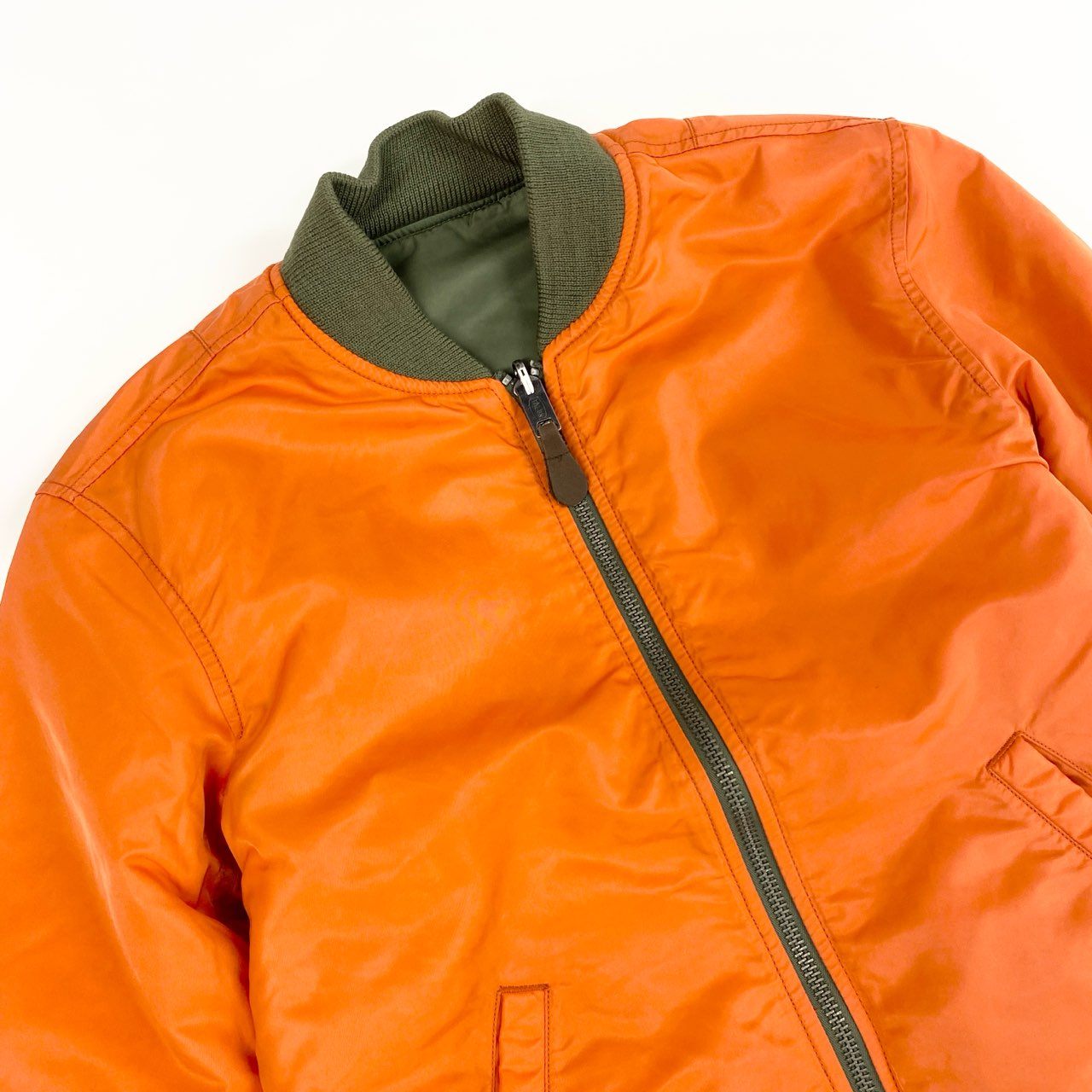 ポロ ラルフローレンのリバーシブルMA-1ジャケット。カーキグリーン面はミリタリー風のワッペンや刺繍ロゴ、フライトパッチが施され、無骨で男らしい雰囲気を演出。裏面は鮮やかなオレンジ無地で、王道のフライトジャケットスタイルを楽しめます。光沢感のあるナイロン素材とリブ仕様で防風性・保温性に優れ、タウンユースからアウトドアまで幅広く活躍。1着で2通りのスタイルを楽しめる存在感あるアウターです。