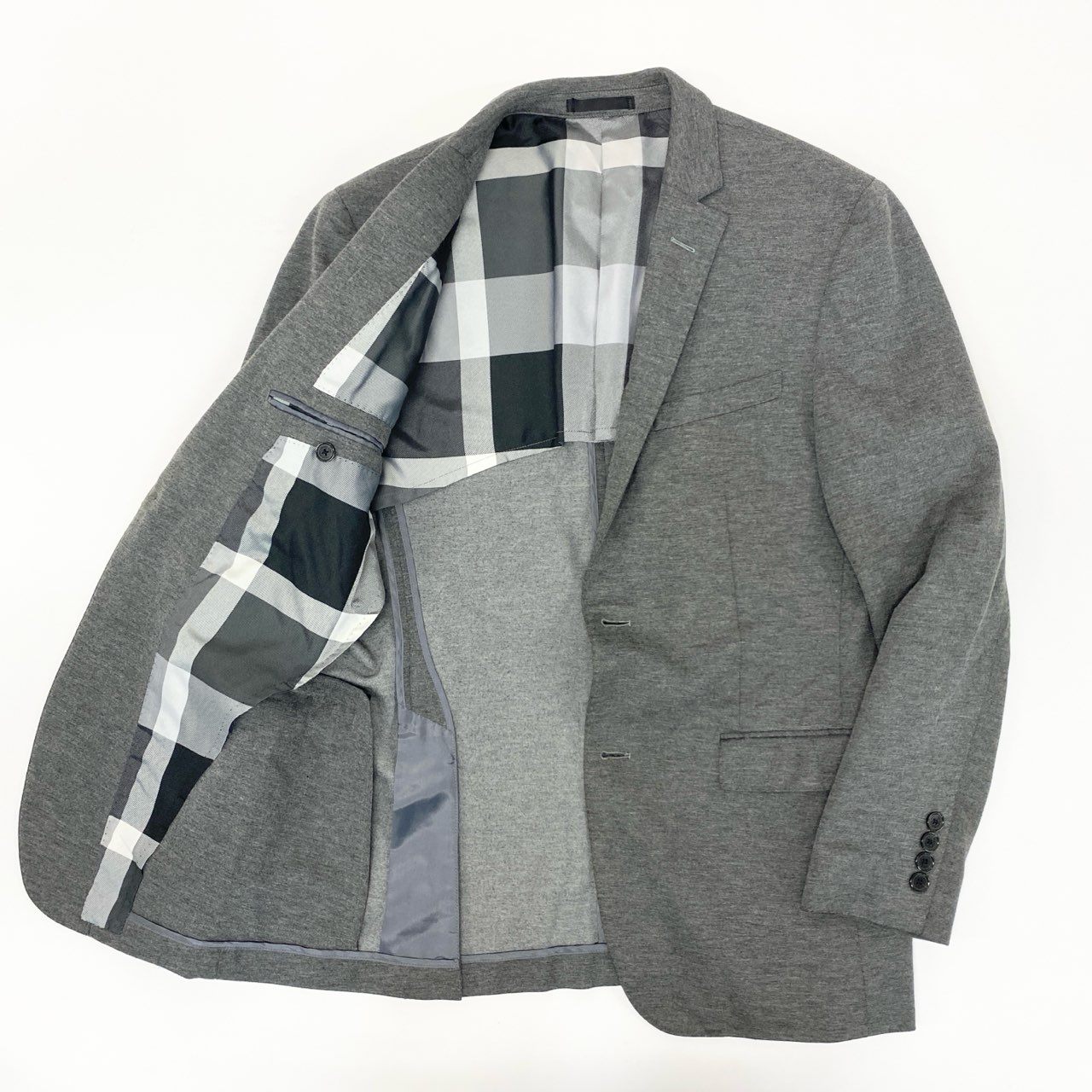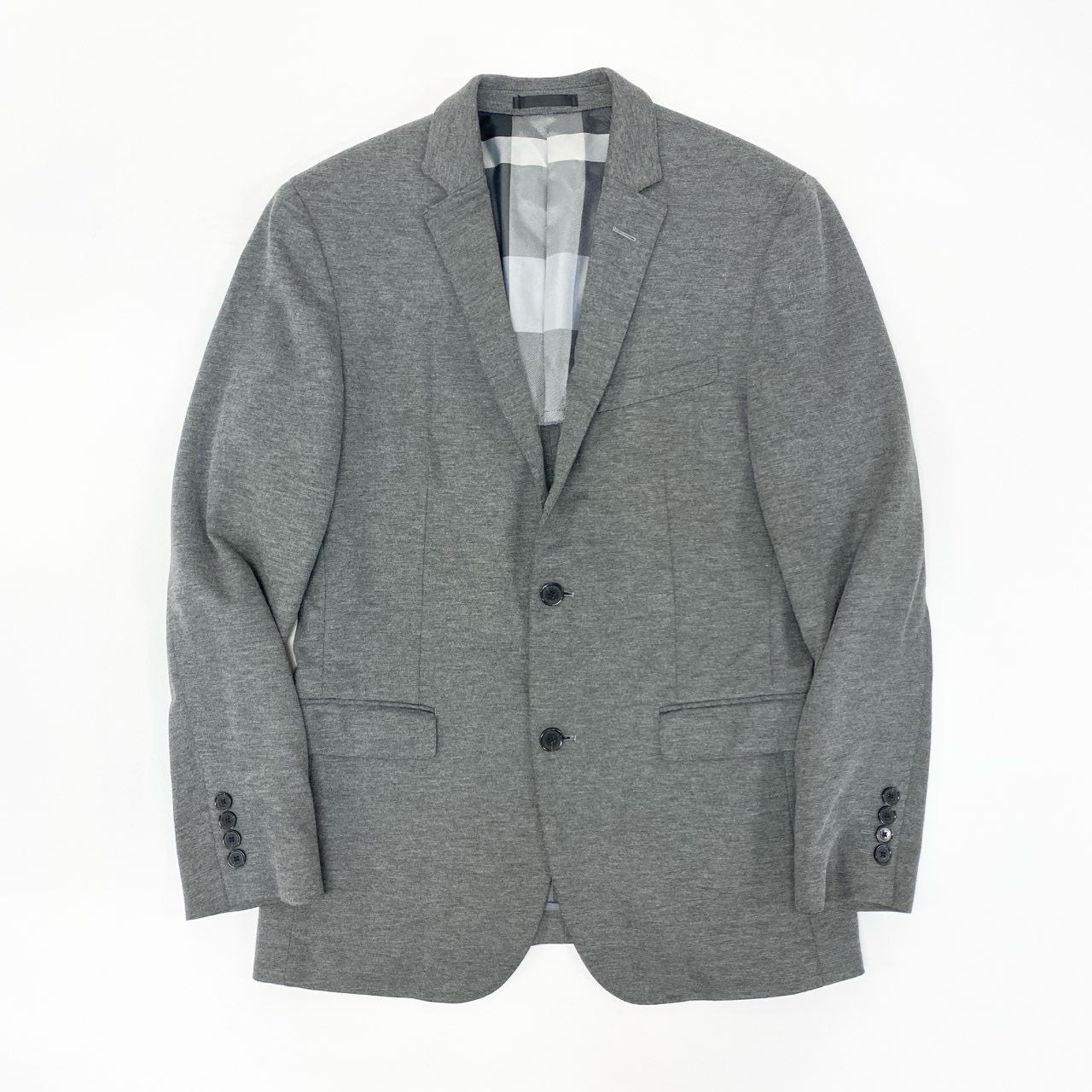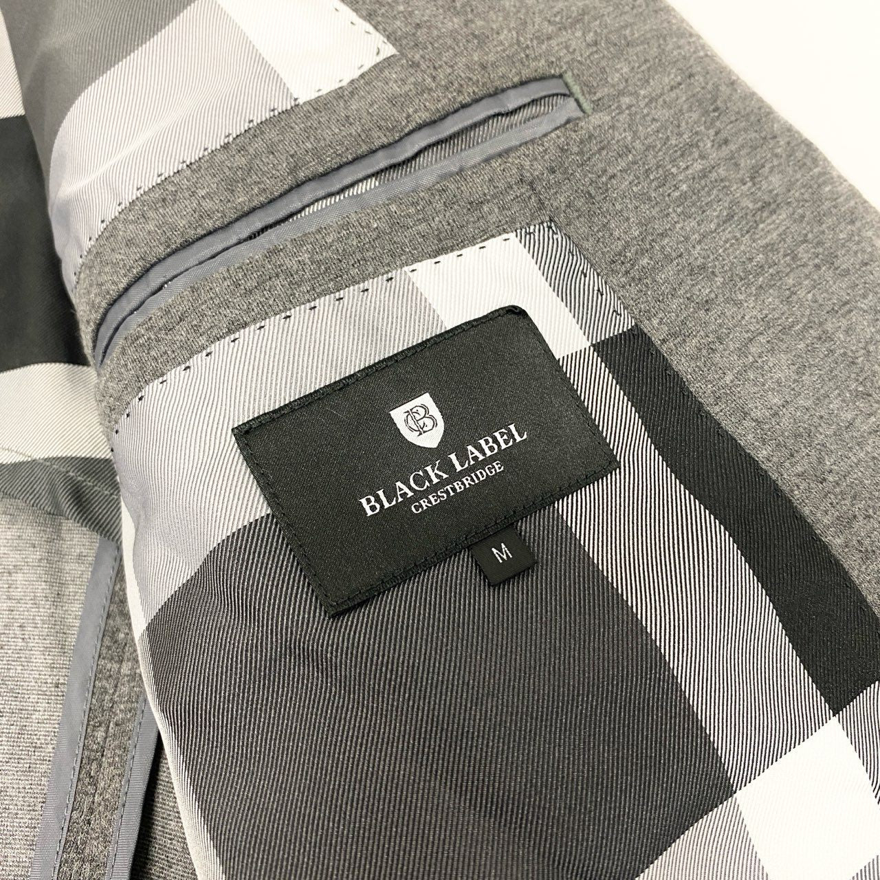 BLACK LABEL CRESTBRIDGE(ブラックレーベル・クレストブリッジ)のテーラードジャケット〈51D10-404-06〉。ライトグレーの無地に近い杢調カラーで、落ち着いた印象を与えるマットなウール混素材を使用。裏地にはブランドらしいクレストブリッジチェックをあしらい、見えない部分にも上質感を演出しています。軽量かつストレッチ性に優れ、デイリーからオフィスシーンまで幅広く活躍する一着です。