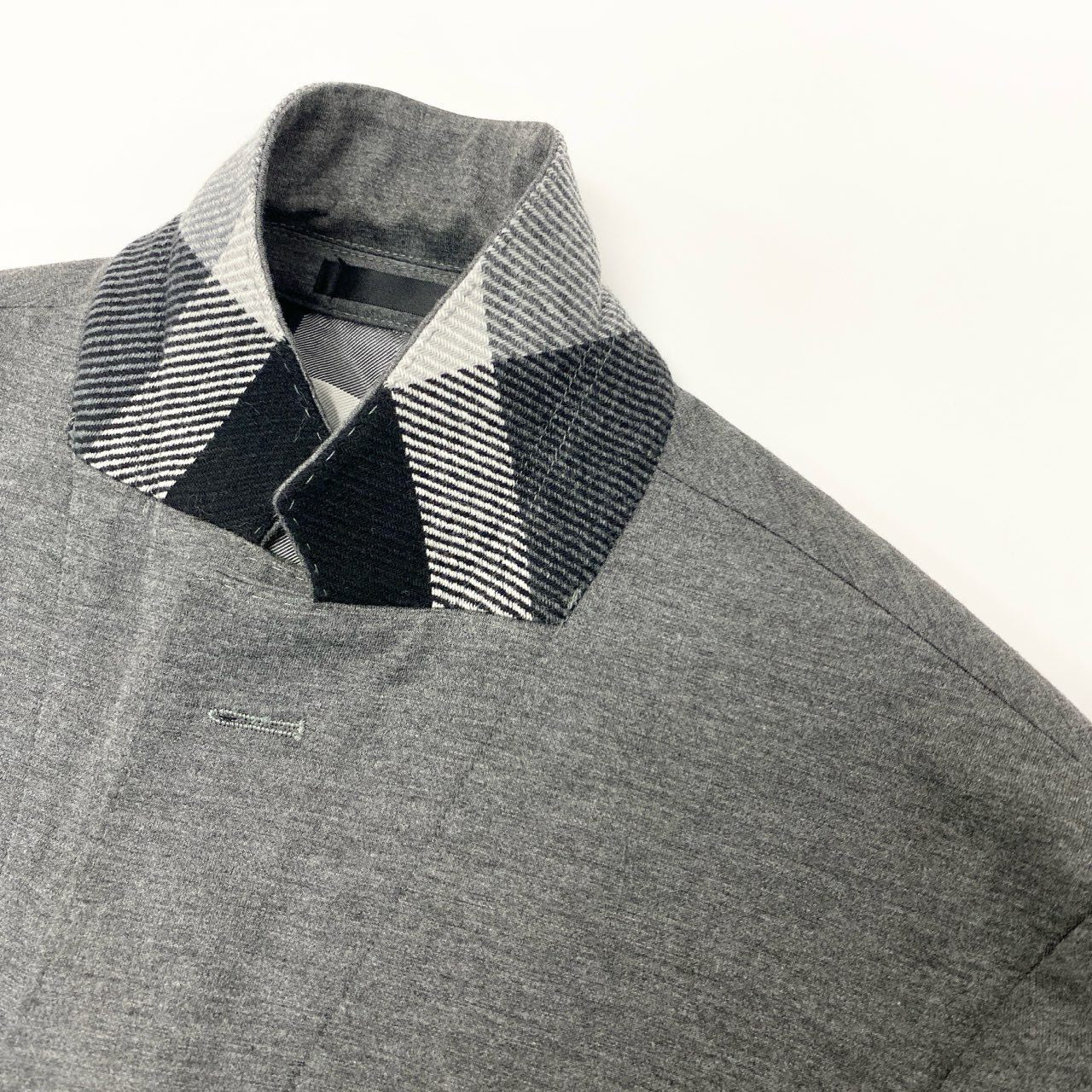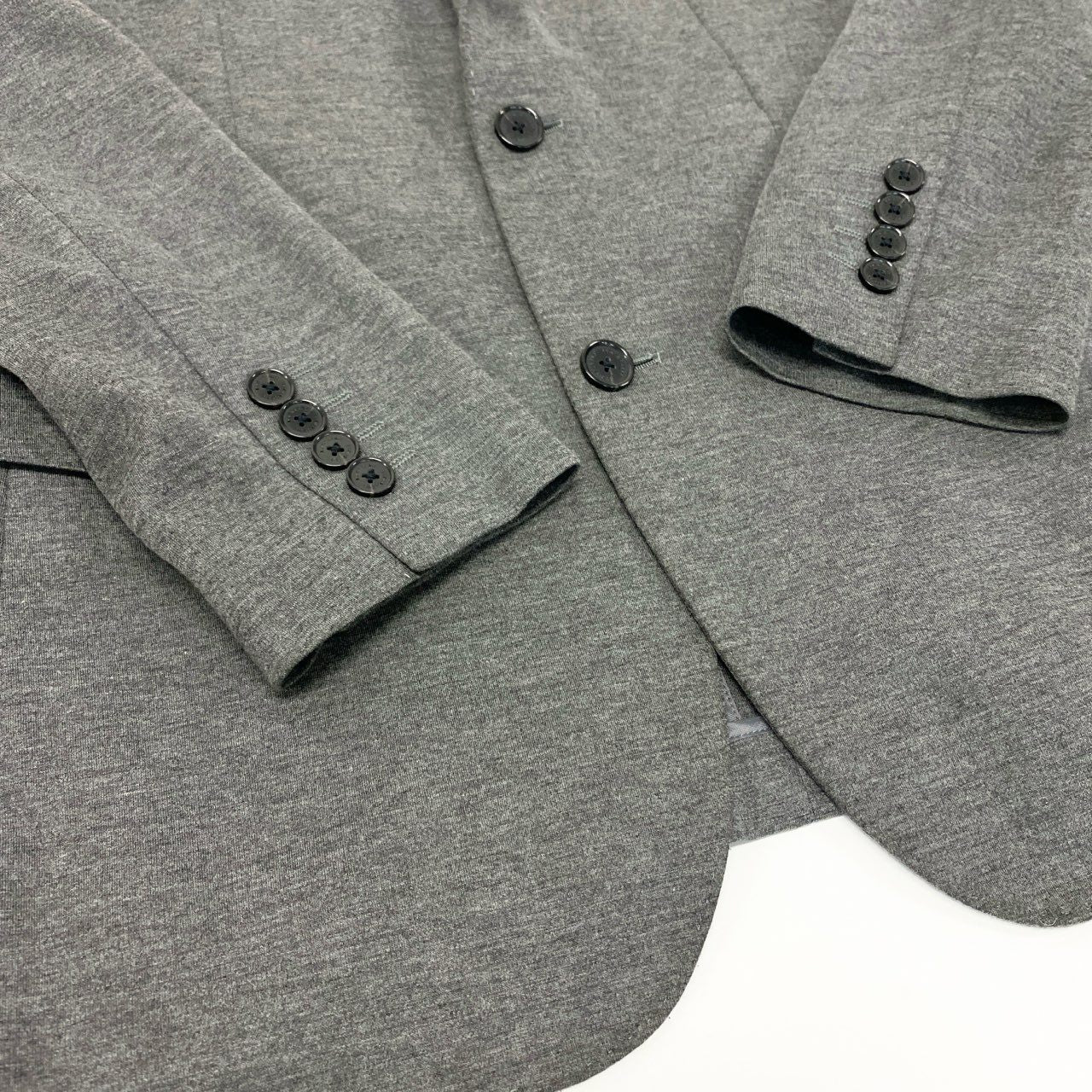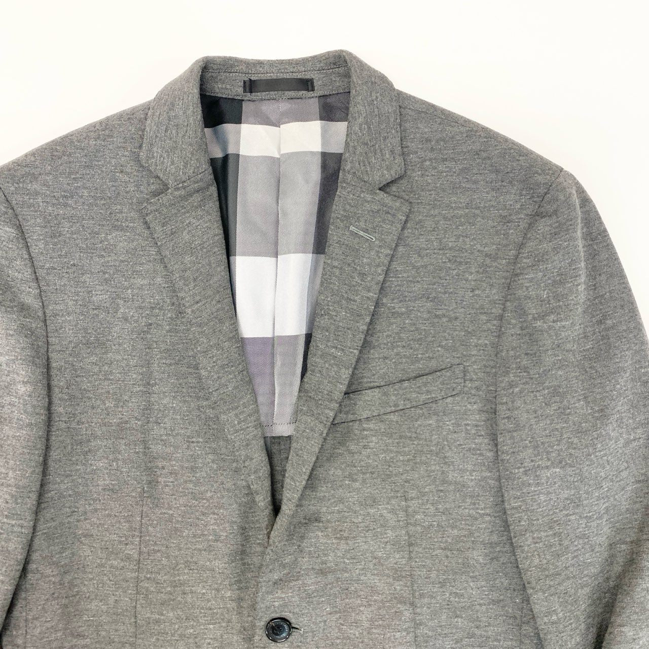 BLACK LABEL CRESTBRIDGE(ブラックレーベル・クレストブリッジ)のテーラードジャケット〈51D10-404-06〉。ライトグレーの無地に近い杢調カラーで、落ち着いた印象を与えるマットなウール混素材を使用。裏地にはブランドらしいクレストブリッジチェックをあしらい、見えない部分にも上質感を演出しています。軽量かつストレッチ性に優れ、デイリーからオフィスシーンまで幅広く活躍する一着です。