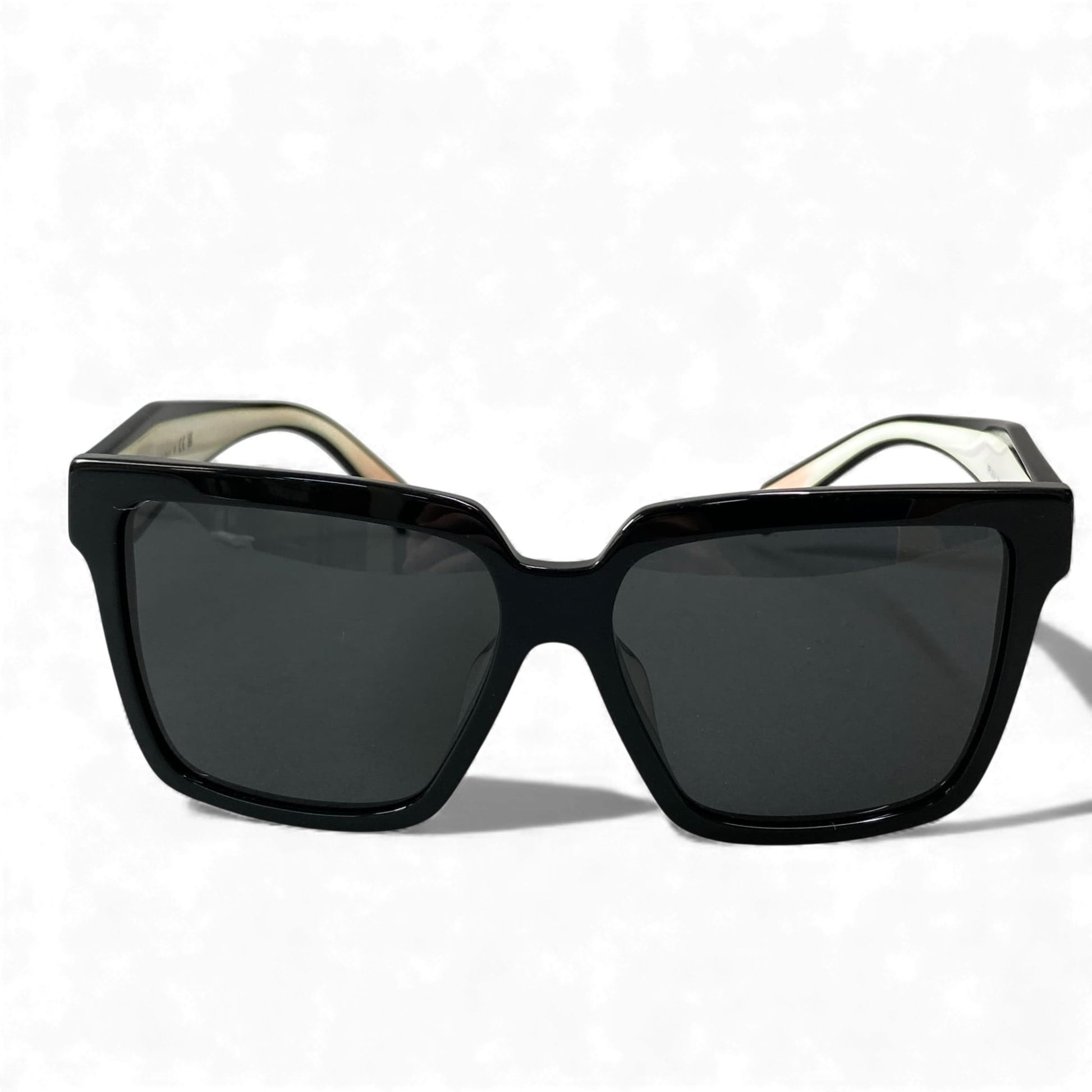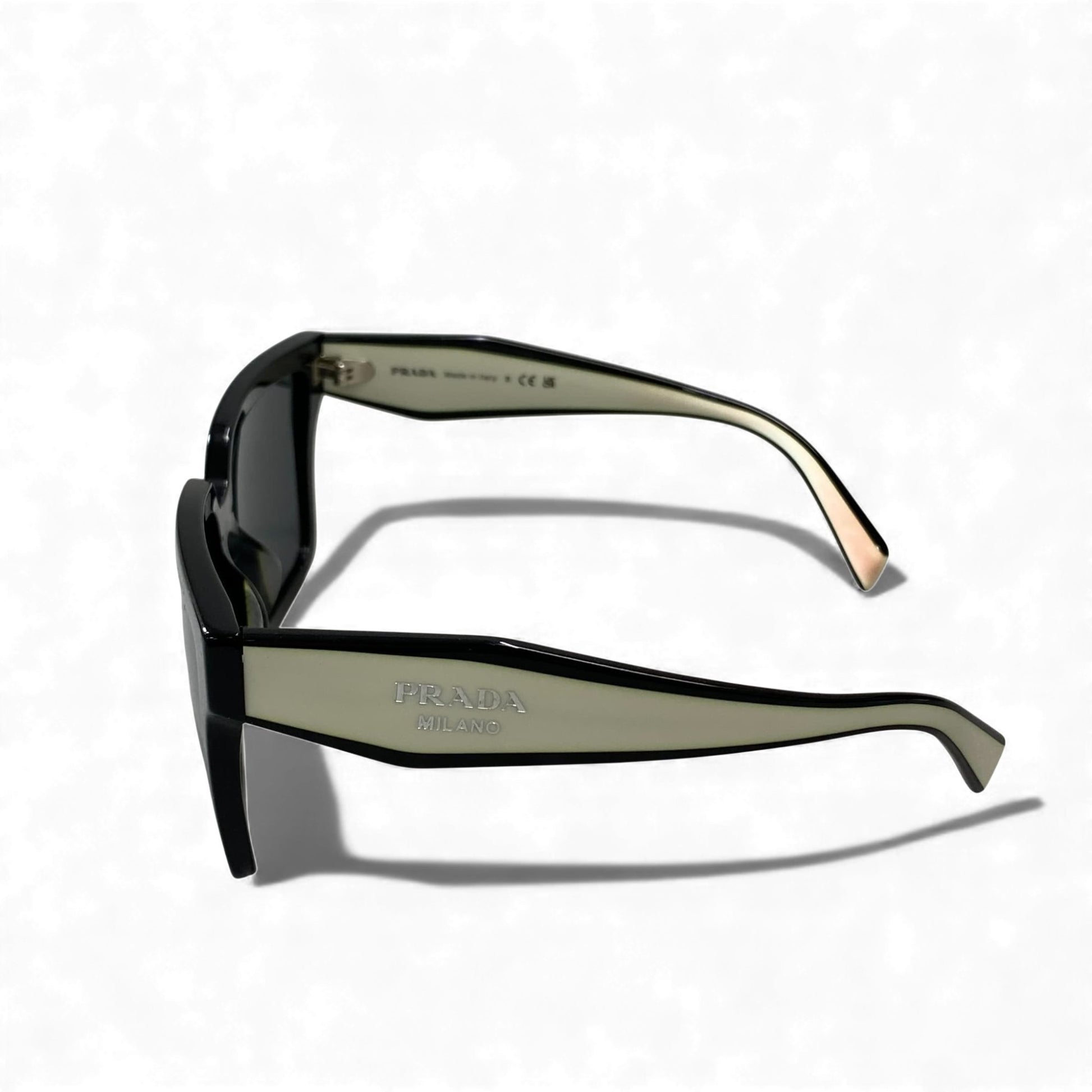 PRADAのサングラスは、マットブラックに近いディープブラックフレームとダークスモークレンズの組み合わせが印象的な一本です。 直線的なスクエアフォルムと厚みのあるフレームが、モード感と都会的な雰囲気を強く演出します。 フレーム素材はマット寄りの質感で、指紋が目立ちにくく実用性にも優れています。 カジュアルからモード、ストリートスタイルまで幅広く合わせやすく、コーディネートを引き締める主役級サングラスです。