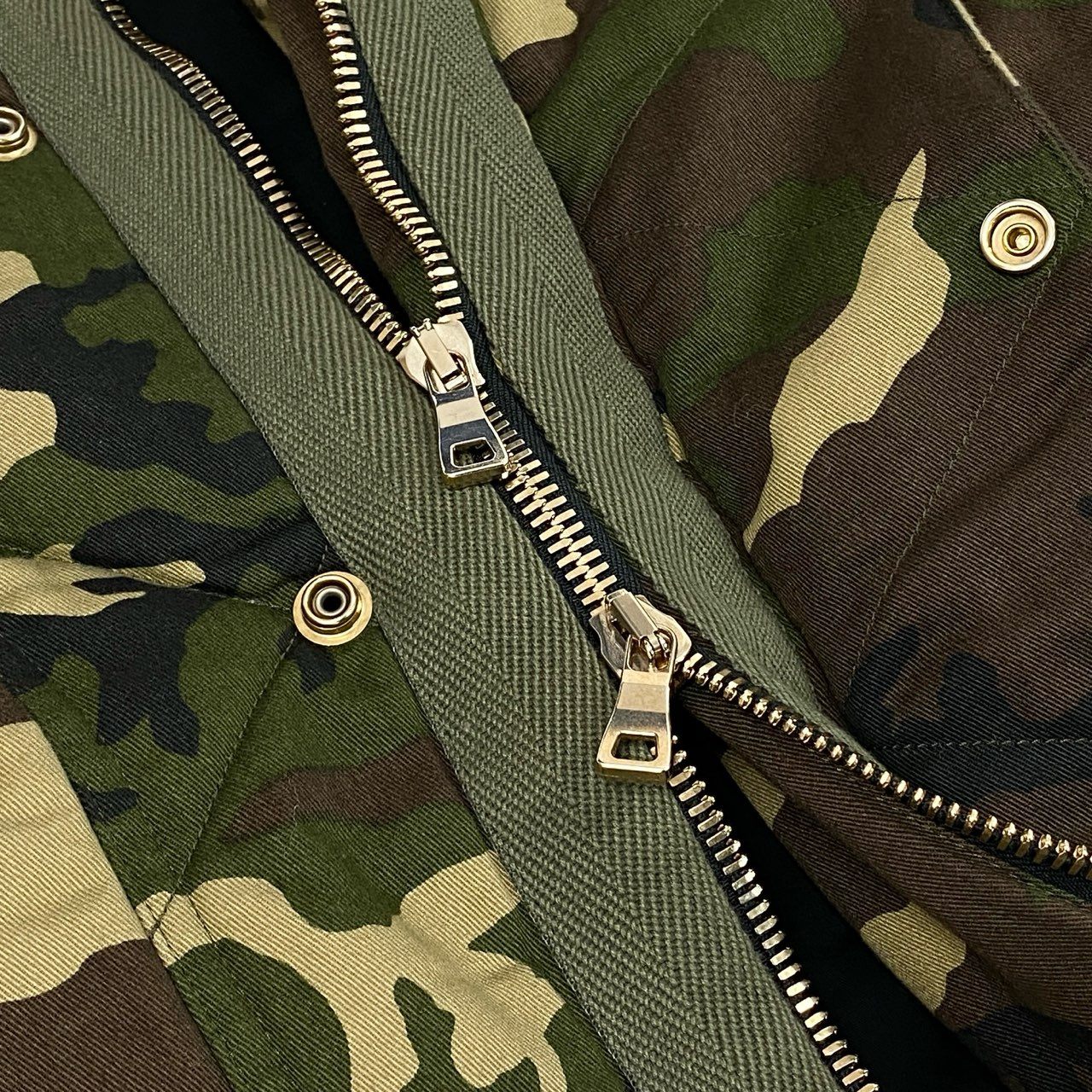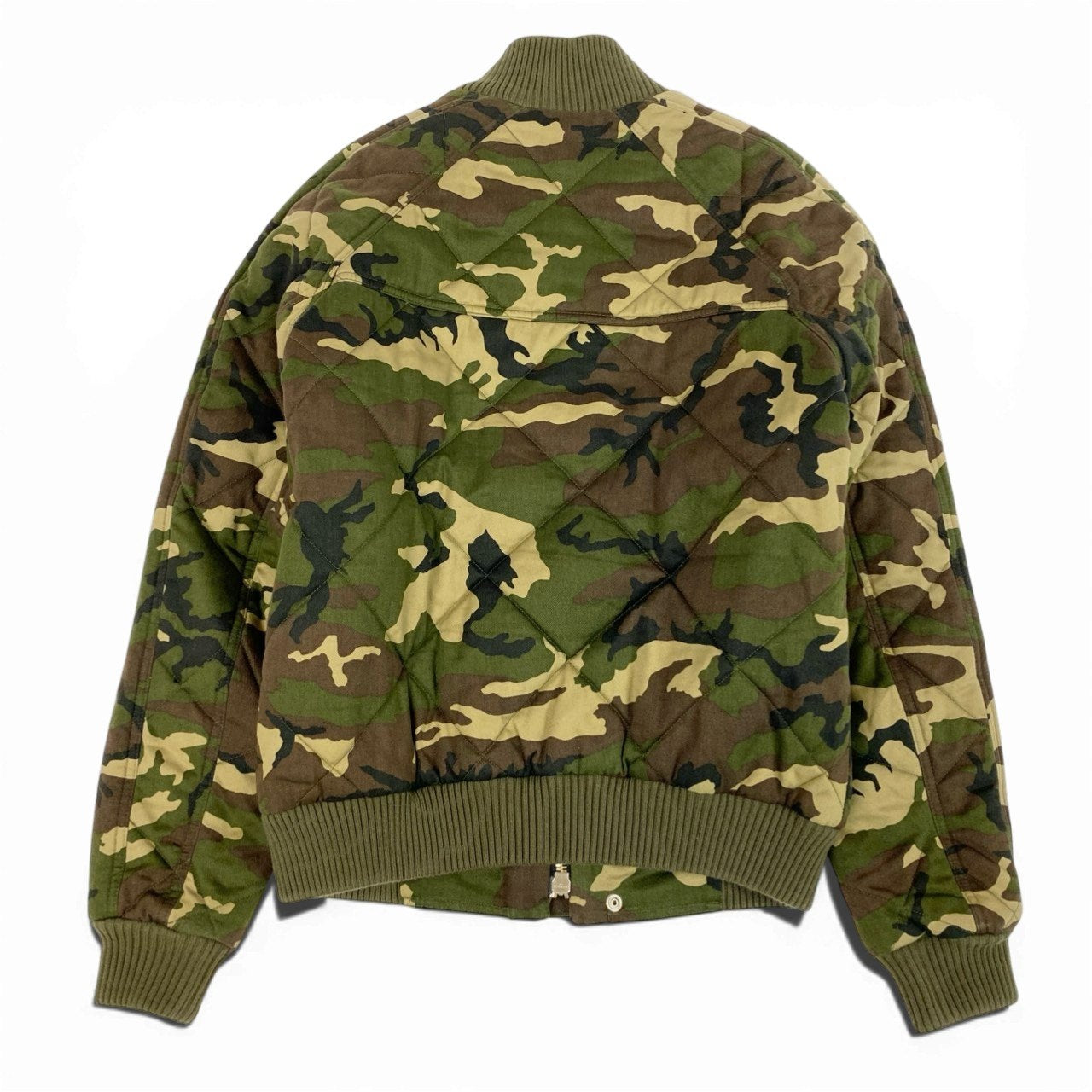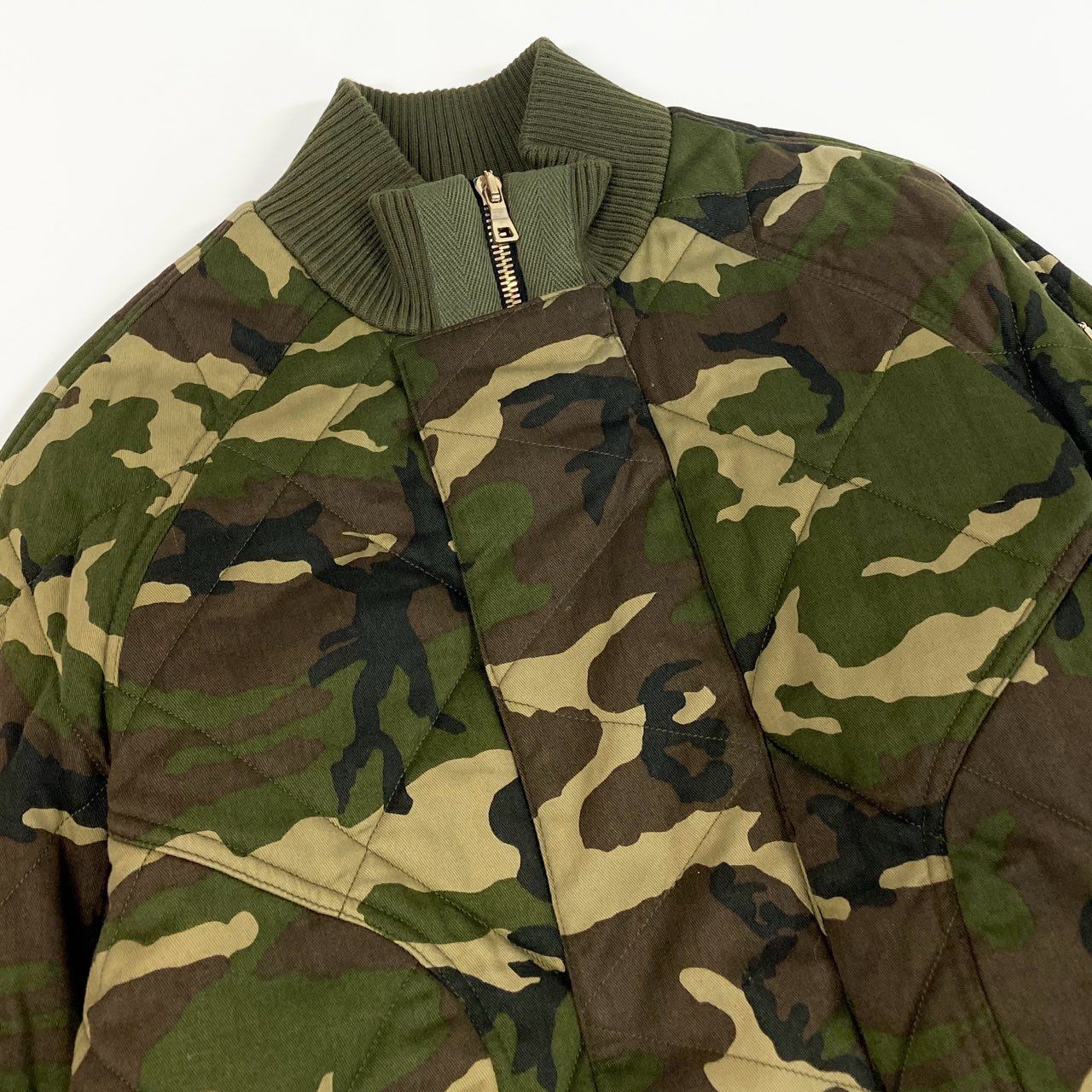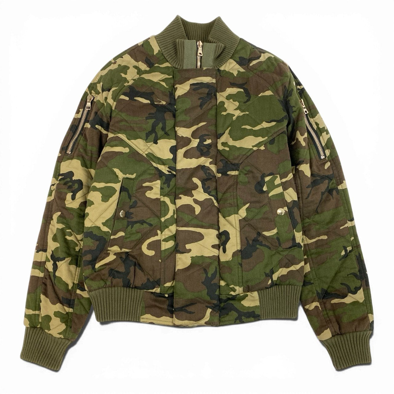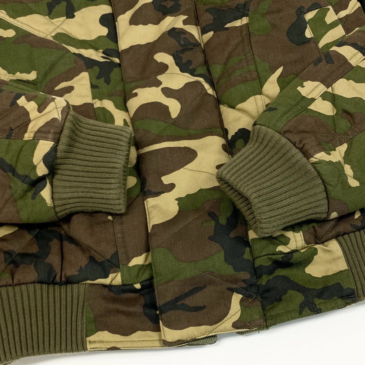 カーキグリーン・オリーブ・ブラウンを基調としたカモフラージュ柄が印象的なボンバージャケットです。 マットな質感のキルティング素材を使用し、ミリタリーテイストとモード感を兼ね備えたデザインに仕上がっています。 袖のメタルジップディテールやリブ仕様の襟・裾が、全体を引き締めるアクセントに。 2017年モデルらしい存在感があり、タウンユースやストリートスタイルの主役として活躍する一着です。