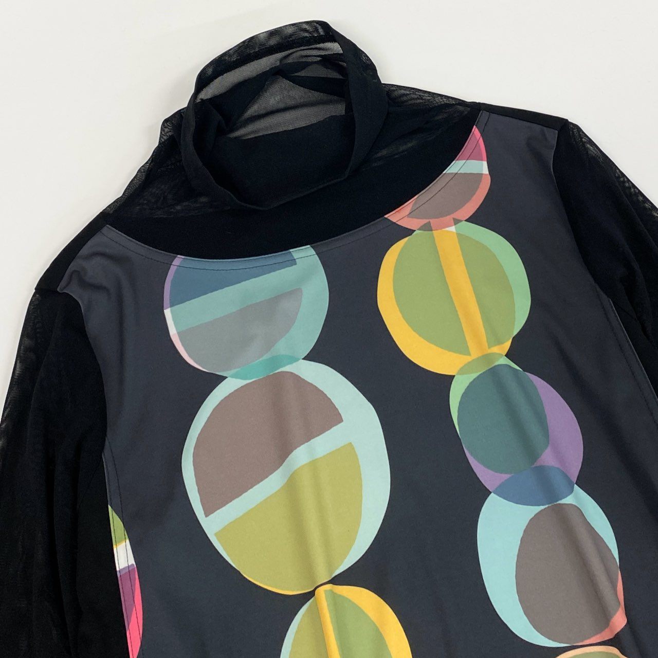 深い ブラック×チャコールグレー をベースに、フロントへ カラフルな円形グラフィック を大胆に配した、トクコプルミエヴォルらしいアート性溢れるロングチュニックワンピースです。袖はほんのり透ける シアースリーブ、ネックから肩にかけては メッシュ切替 を使用し、軽やかでモードな印象に仕上がっています。動くたびに揺れるAラインシルエットが美しく、1枚で華やぐ主役級アイテム。デイリーのお出かけからイベント・旅行まで幅広く使える一着です。