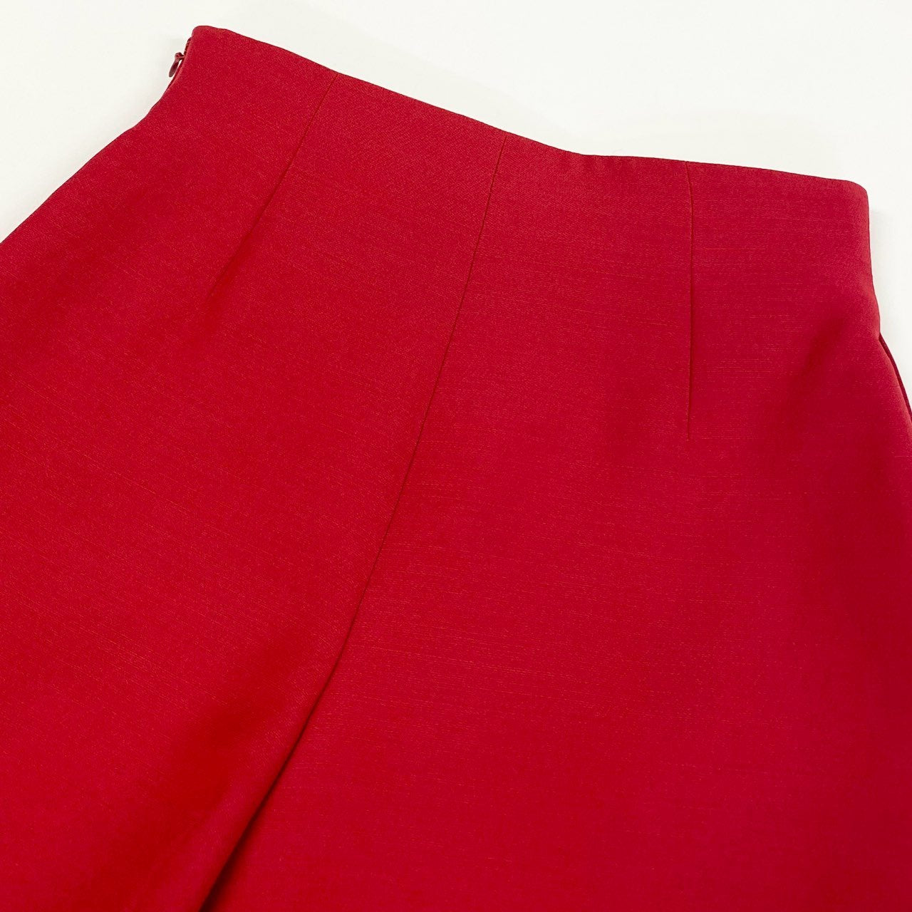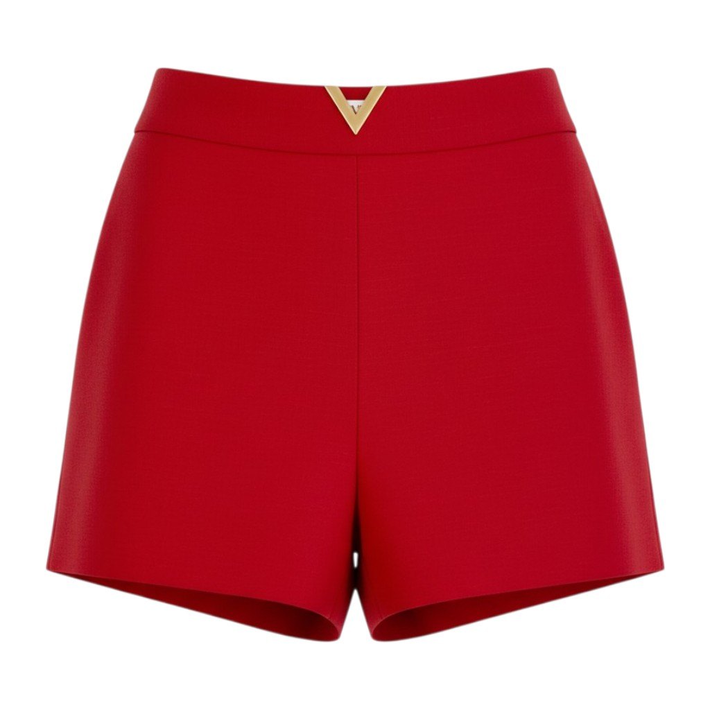 VALENTINOのショートパンツです。鮮やかなクリムゾンレッドの無地デザインに、ウエスト中央のV字ゴールドロゴがラグジュアリーなアクセント。ハリ感のある滑らかなマット素材で、立体的なフォルムが美しく際立ちます。シンプルながら存在感があり、トップスをインするスタイルでウエストデザインを強調する着こなしがおすすめ。リゾートからタウンユースまで華やかに映える一着です。