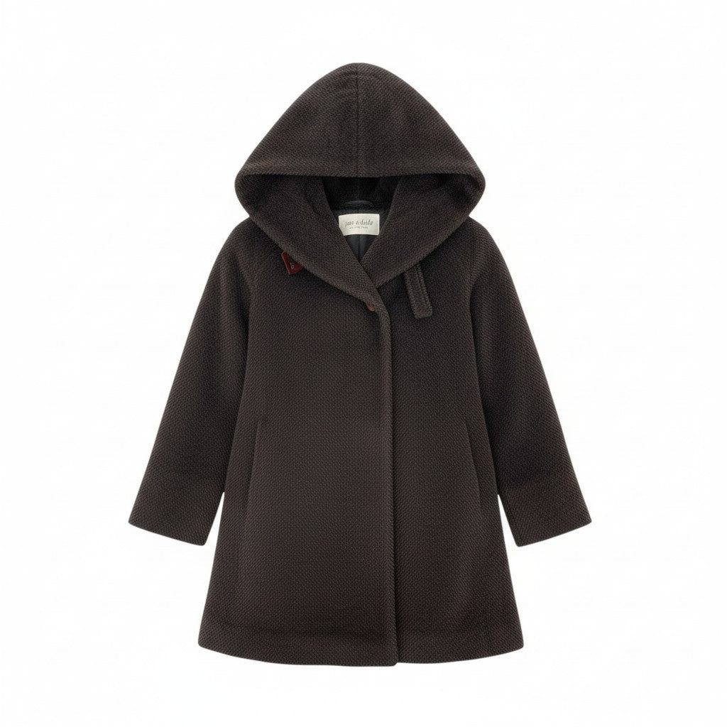 深みのあるブラウンカラーに上質なベビーラマ素材を使用した、ジュンアシダのフーデットコートです。柔らかく暖かい高級素材PIACENZAの生地が、しっとりとした高級感を演出します。大きめフードと立体的なショールカラーが上品なアクセントとなり、シンプルながら存在感のある一着。ゆったりした身幅で重ね着しやすく、真冬の普段使いからおでかけまで幅広く活躍します。上質を求める大人の女性におすすめの軽やかでエレガントなコートです。