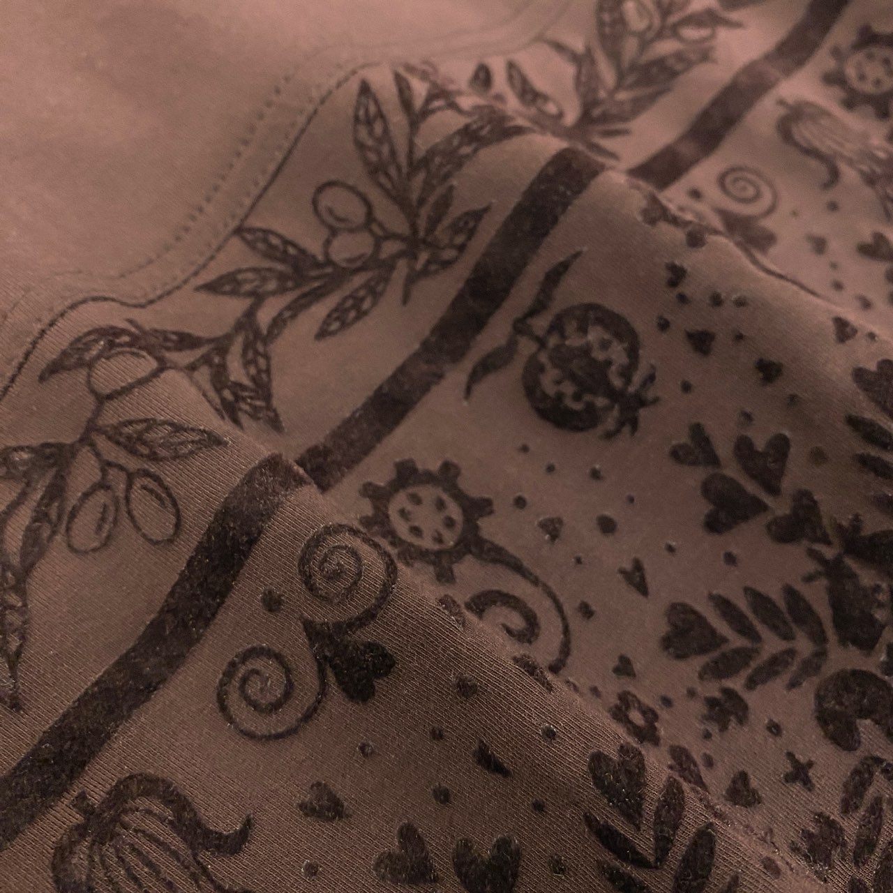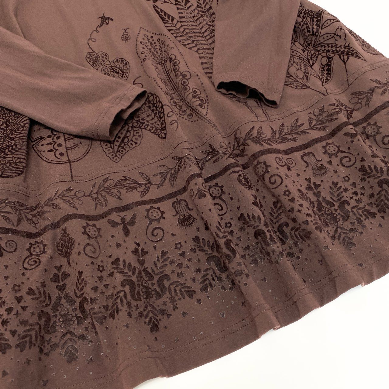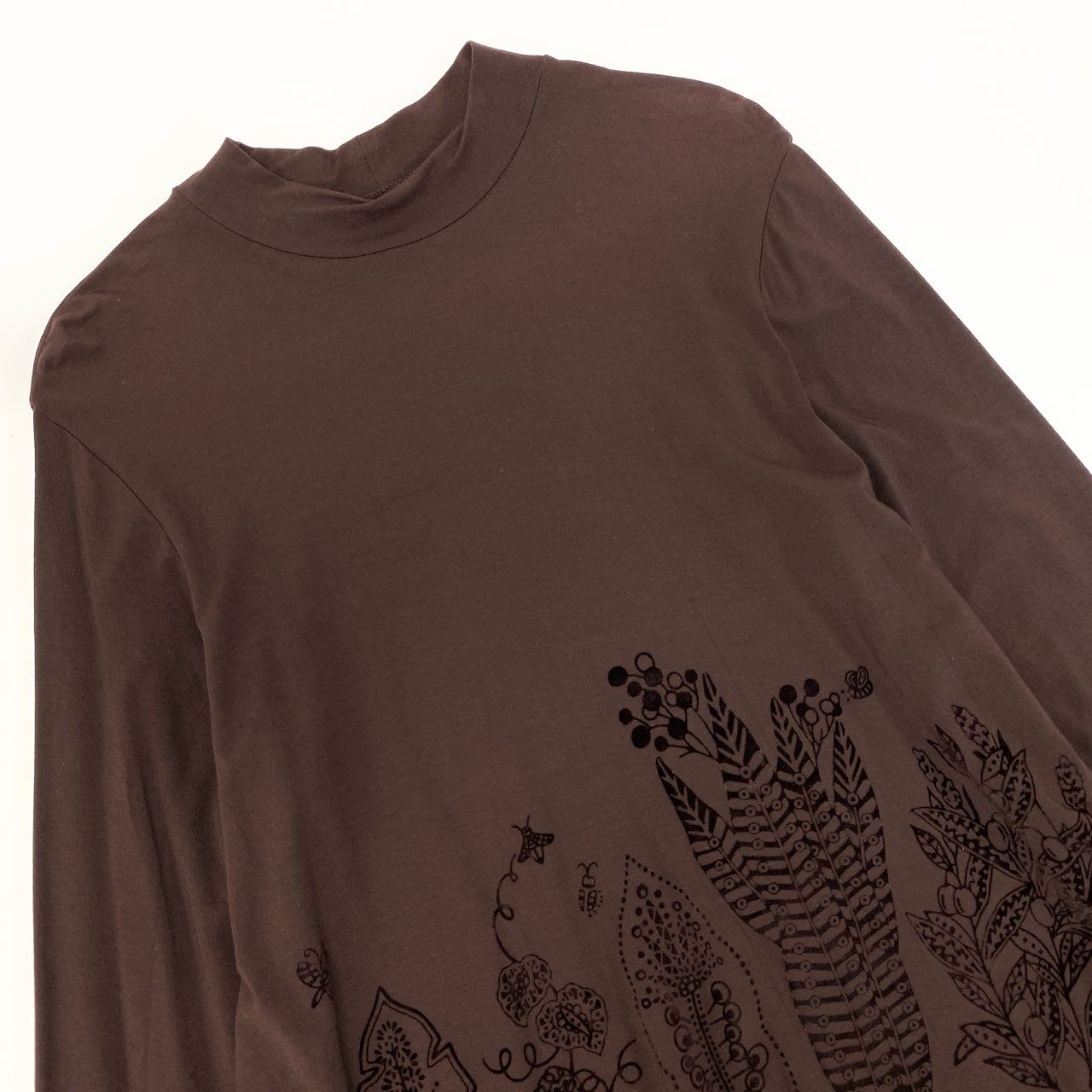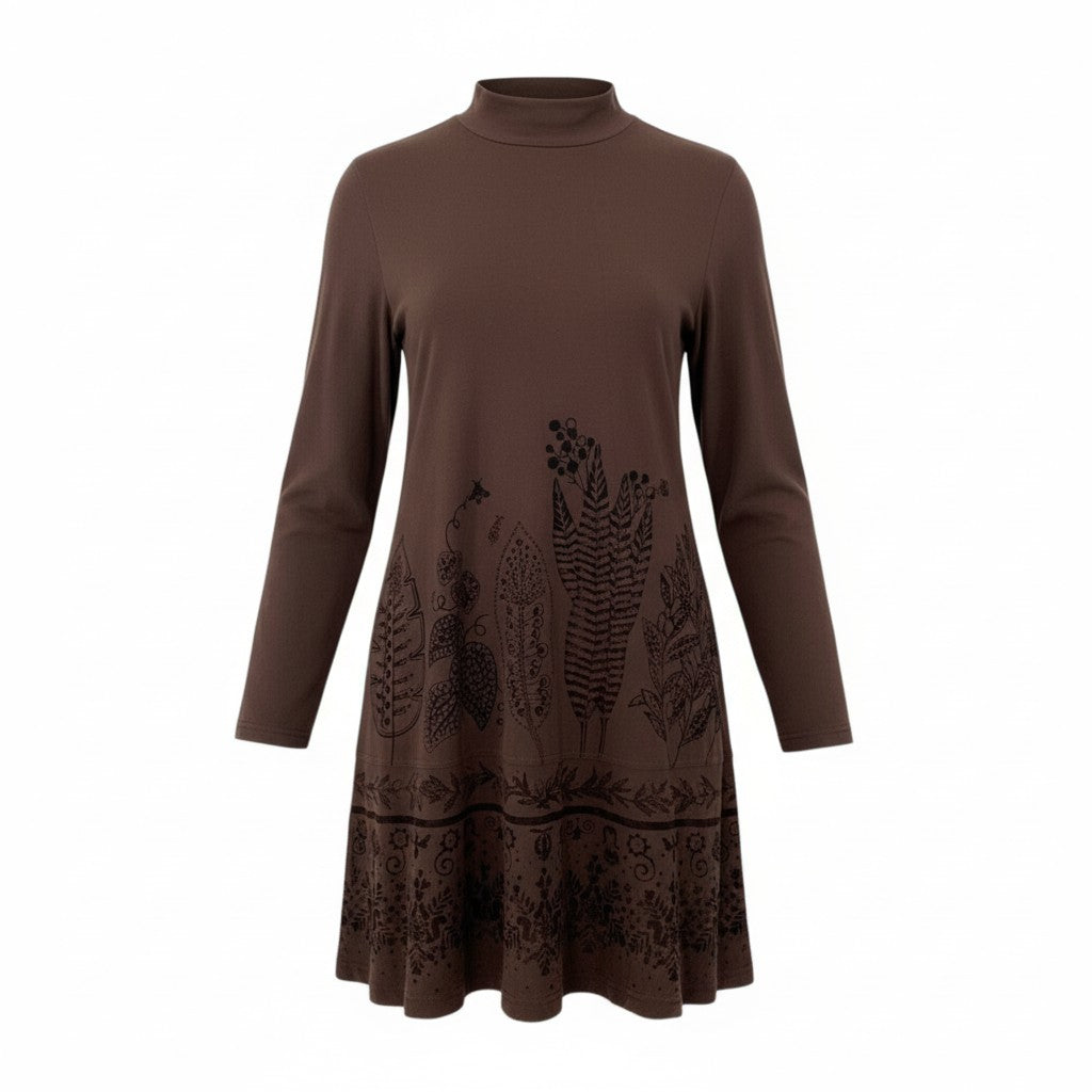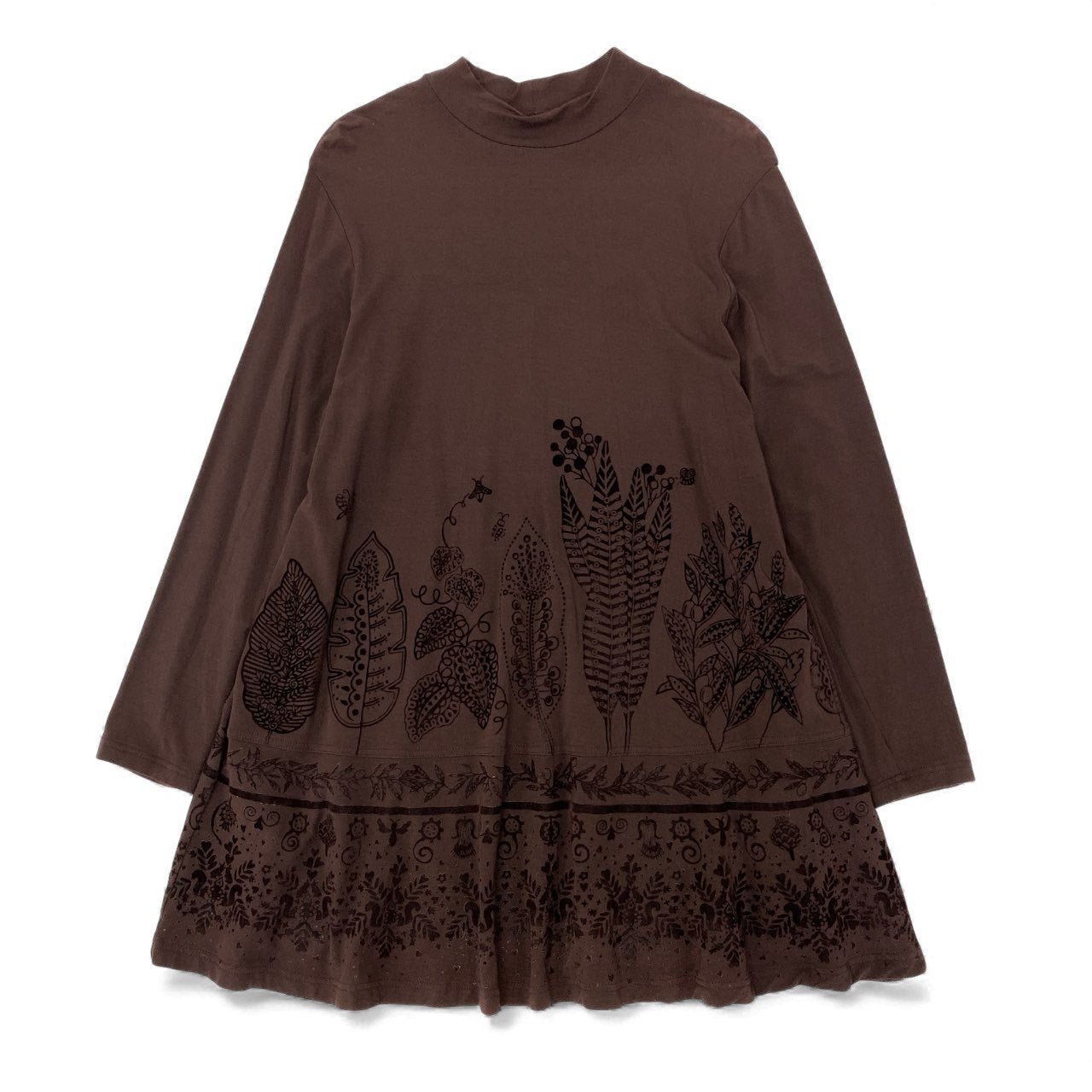 トクコプルミエヴォルらしいアートな雰囲気が楽しめる、ブラウンの長袖チュニックワンピースです。裾に向かって広がるボタニカル柄プリントが華やかで、1枚で存在感のあるコーディネートが完成します。柔らかなストレッチ素材で着心地が良く、モックネックが上品なアクセントに。短めの丈感で、レギンス・スキニー・ロングスカートとのレイヤードも相性抜群です。普段着からお出かけまで幅広く活躍する1着です。